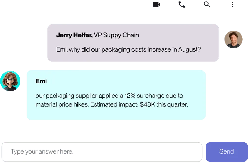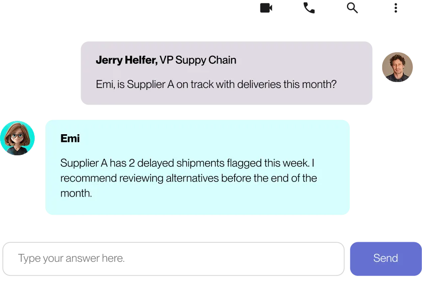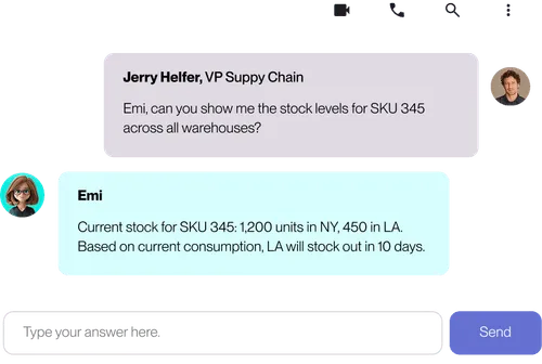 Emi can answer any stakeholder question related to supply chain, procurement and inventory over your Teams or Slack, making information accessible in natural language.