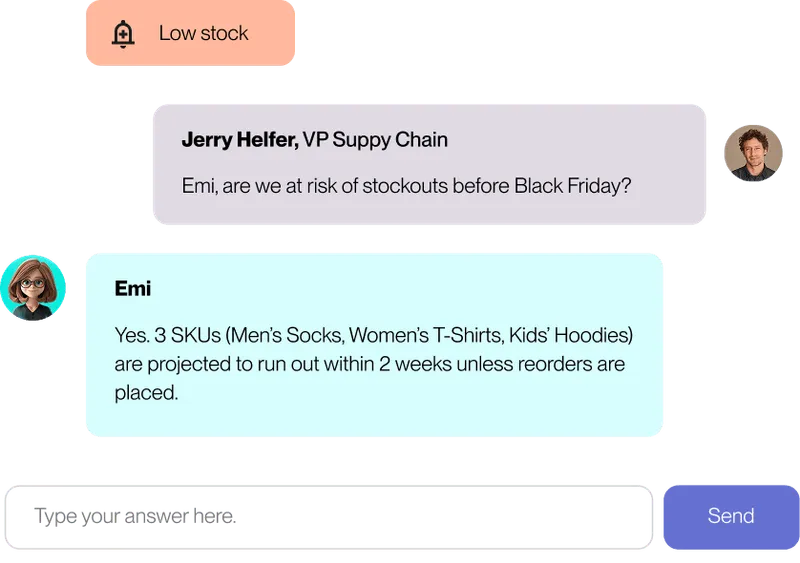 Meet Emi - the AI supply chain agent that boosts margins and prevents stockouts, with proactive alerts and instant answers right inside your workflow.